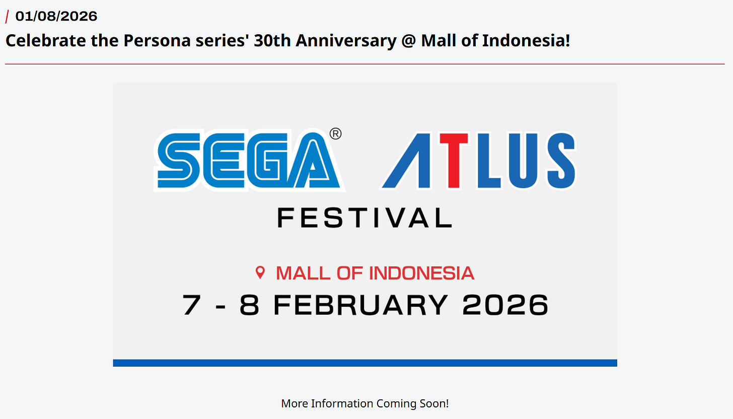 Hai, Player Satu! Persona, JRPG andalan Atlus akan merayakan anniversary mereka yang ke-30 tahun. Atlus dan Sega mengajak fans di Indonesia untuk merayakannya pada event SEGA ATLUS Festival yang akan dilaksanakan pada tanggal 7-8 Februari di Mall of Indonesia, Jakarta Utara. SEGA ATLUS festival adalah event official yang menjadi wadah untuk fans mencoba berbagai macam game keluaran Sega dan Atlus secara eksklusif, juga menjadi fan meeting bagi sesama fans. Tentunya kalian bisa membeli berbagai macam merchandise-nya yang hanya dijual di event ini.