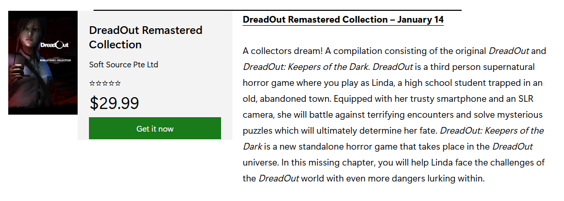 Kemarin di tanggal 9 Januari, XBOX mengumumkan lewat websitenya kalau DreadOut Remastered Collection akhirnya rilis untuk konsol XBOX. Dengan rilisnya Remastered Collection ke XBOX, akhirnya semua seri DreadOut lengkap dapat dimainkan di konsol ini. Yang mana sebelumnya para pengguna XBOX hanya bisa memainkan DreadOut 2 dan spin off-nya DreadHaunt. Pada saat artikel ini dirilis, kalian sudah bisa membeli DreadOut Remastered Collection dengan harga $29,99 atau sekitar Rp500.000 (belum termasuk regional price).