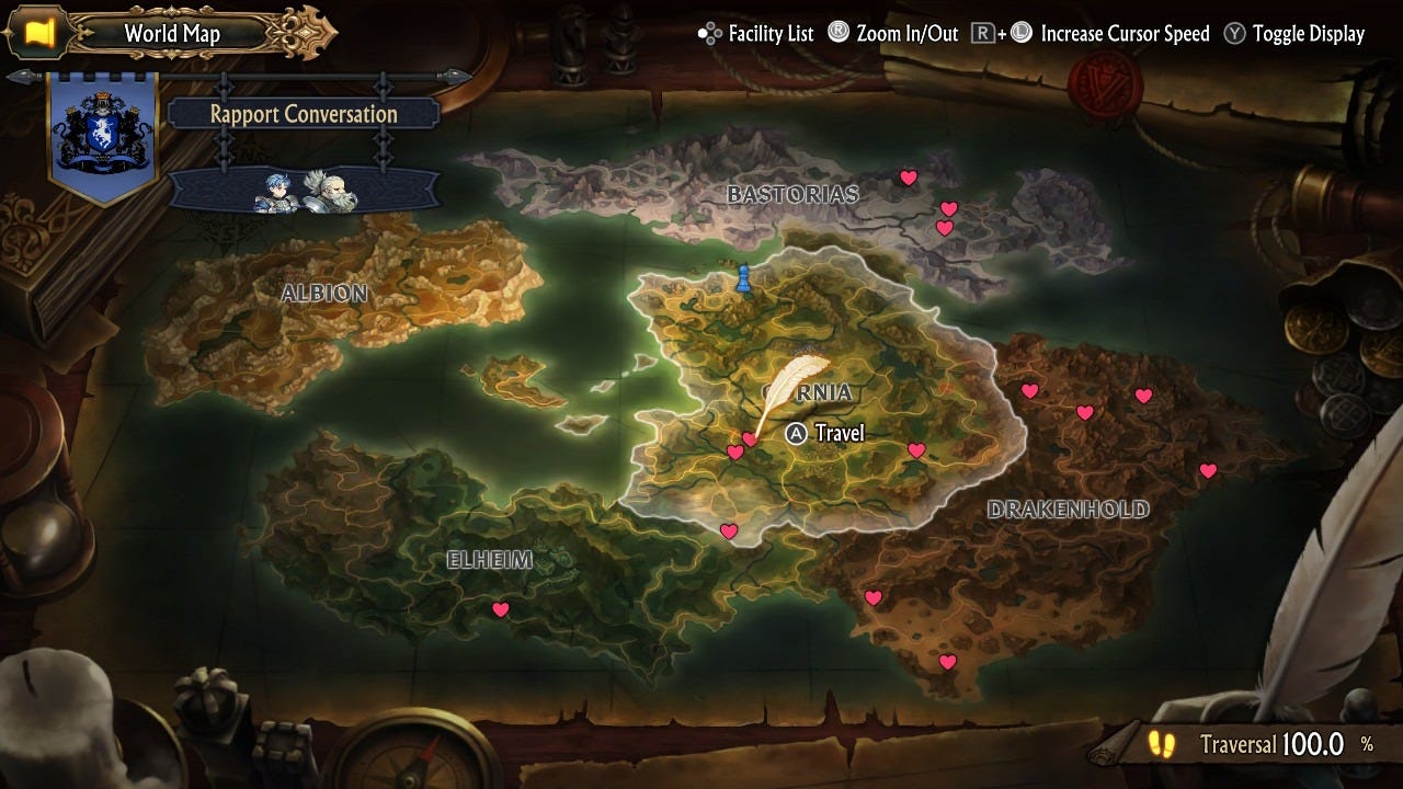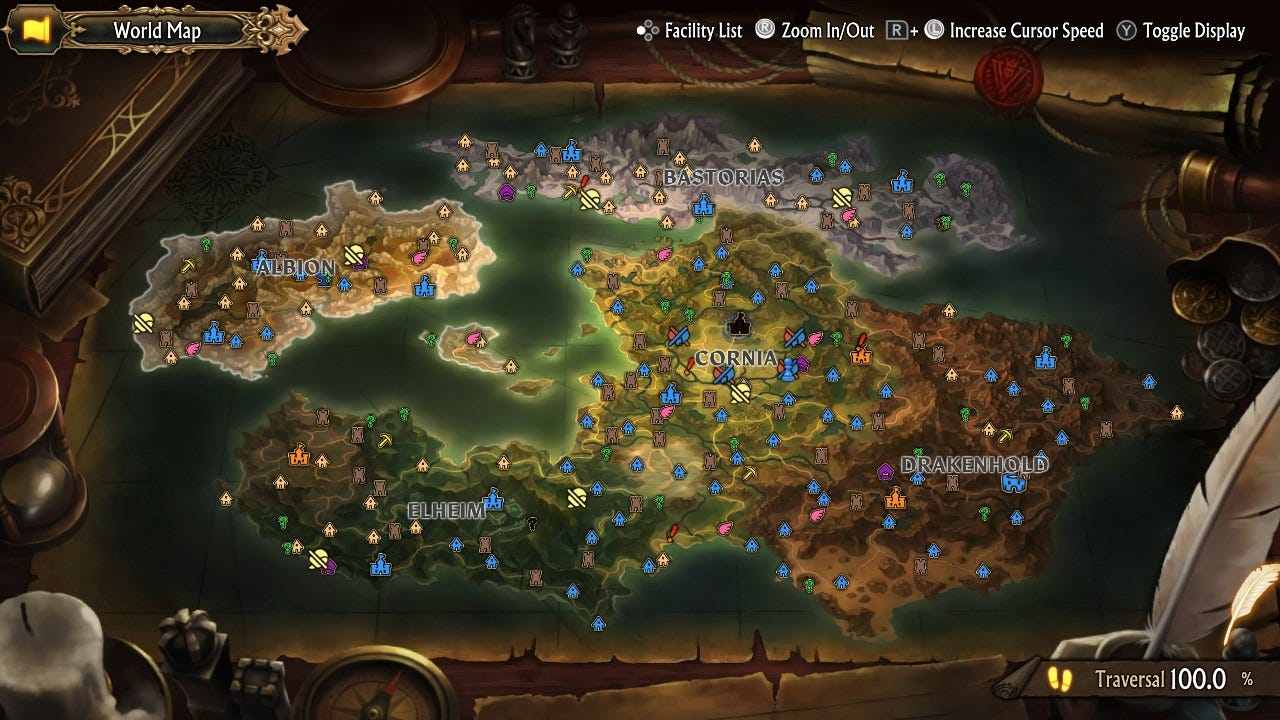 Biasanya dalam game tactic JRPG biasanya map yang ada itu hanya point to point dmna kita sebagai player hanya memilih tempat yang sudah ditentukan, tetapi game ini mengusung tema open world. Dunia yang disuguhkan pun secara kita lihat cukup luas dan dibagi menjadi beberapa bagian dan tema yang berbeda beda,