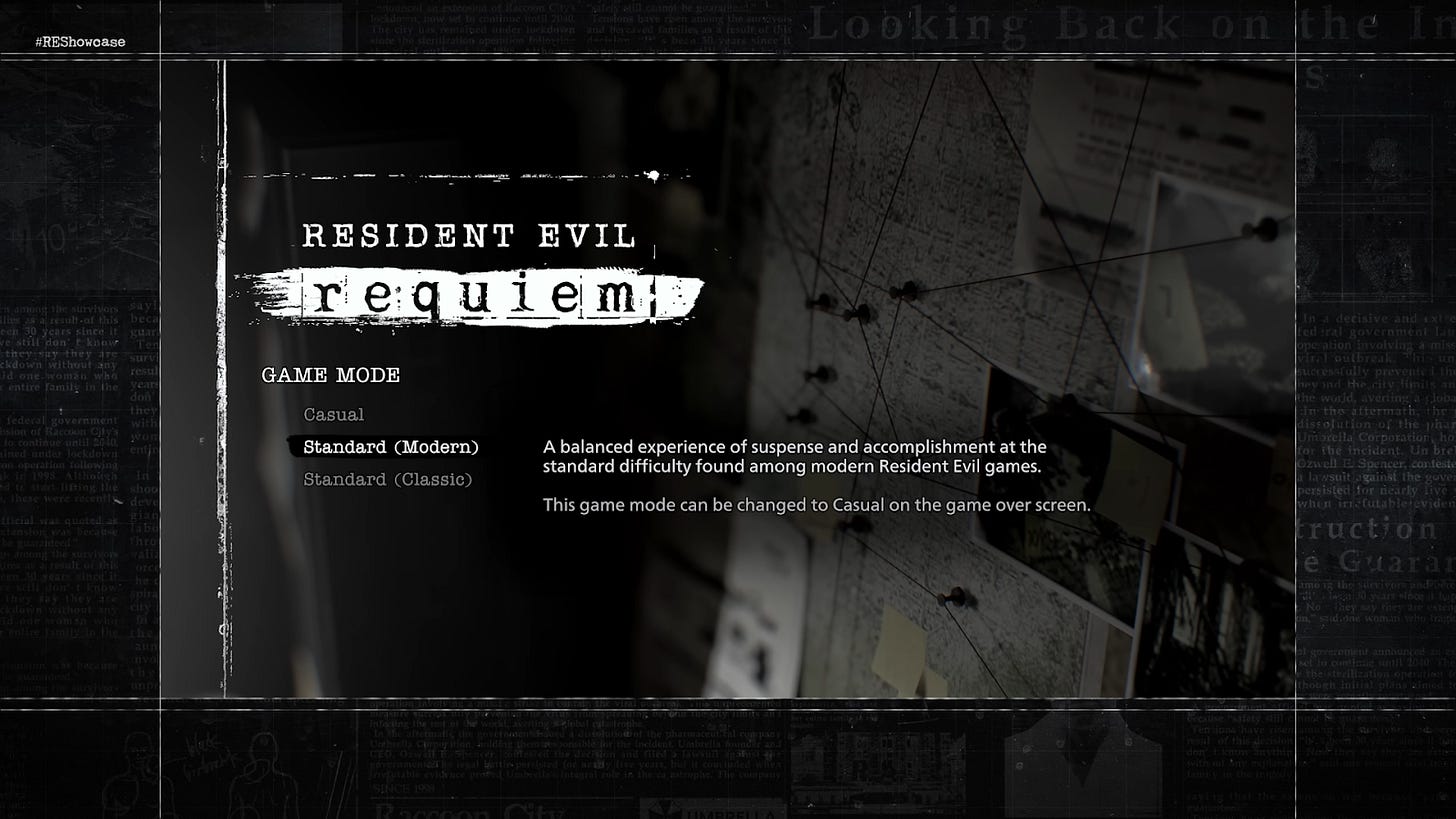 Seperti pada umumnya game Resident Evil, untuk awal game kita akan disediakan 2 difficulties yaitu Casual dan Standard. Tapi ada hal baru, difficulties Standard akan dibagi menjadi 2 yaitu Standard Modern dan Standard Classic. Perbedaan pada kedua difficulties ini hanya pada saat save, jika di Standard Classic kita memerlukan “Ink Ribbon” pada bagian Grace. Jadi kita akan dapat limitasi saat melakukan save berdasarkan jumlah ink ribbon yang kita punya.