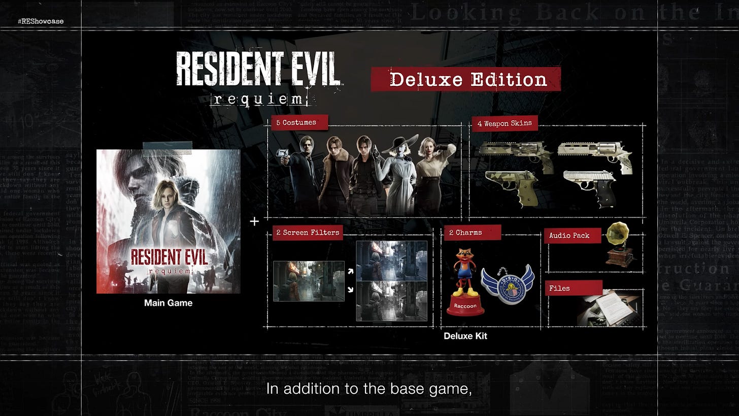Di showcase ini juga, kita dikasih tau bonus apa saja yang kita dapatkan kalau Pre-Order atau beli Deluxe Edition. Untuk kalian yang sudah Pre-Order Resident Evil Requiem, kalian dapetin kostum tambahan untuk Grace yaitu kostum Apocalypse. Dan untuk Deluxe Edition, kalian bakal banyak lebih banyak mulai dari kostum untuk Leon dan Grace, skin weapon, audio pack, screen filter, dan lain-lain.