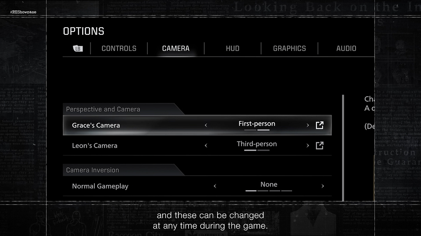 Dan satu detail baru lagi, perspektif kamera untuk Leon dan Grace terpisah satu sama lain. Jadi kita nanti bisa nentuin pake Third-Person untuk Leon dan First-Person untuk Grace atau sebaliknya. Hal ini bikin kita sebagai player punya kebebasan dalam menentukan perspektif kamera sesuai dengan kenyamanan kita dalam bermain.